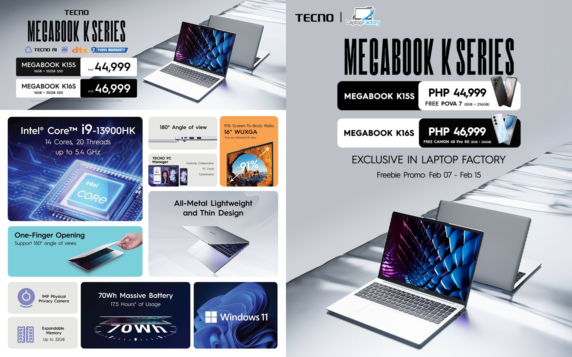 - Buy the MEGABOOK K16s 13th (SRP: ₱46,999) and get a FREE TECNO CAMON 40 Pro 5G (8+256GB)