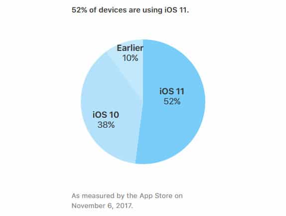 Apple’s developer support page posted the latest iOS 11 installation percentage, which currently sits at 52 percent. While that seems great at first for a version that’s been out for only 47 days, iOS 10 and 9 did better during the same time frame.