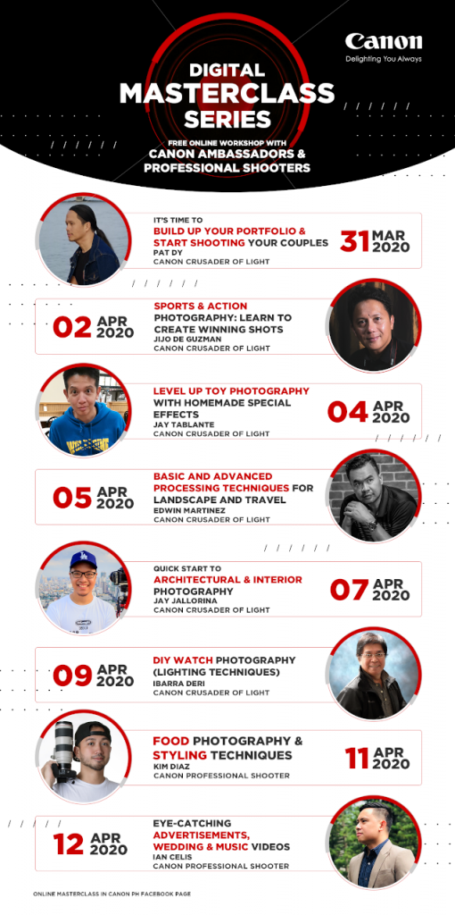 Are you looking for things-to-do to pass the time while at home? Then, take a peek at Canon Philippines’ Facebook page. From March 31 until April 28, you can participate in the digital masterclass series by Canon. It’s an online class of sorts that brings together Canon ambassadors and professionals as they share tips and tricks on how to improve photography skills.