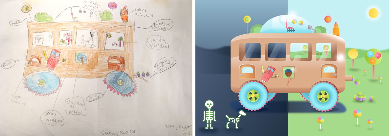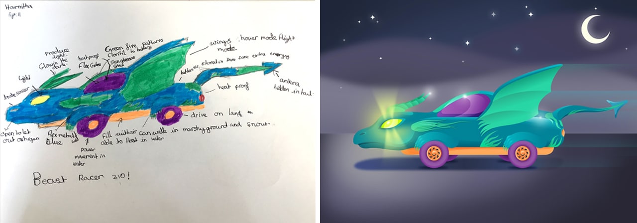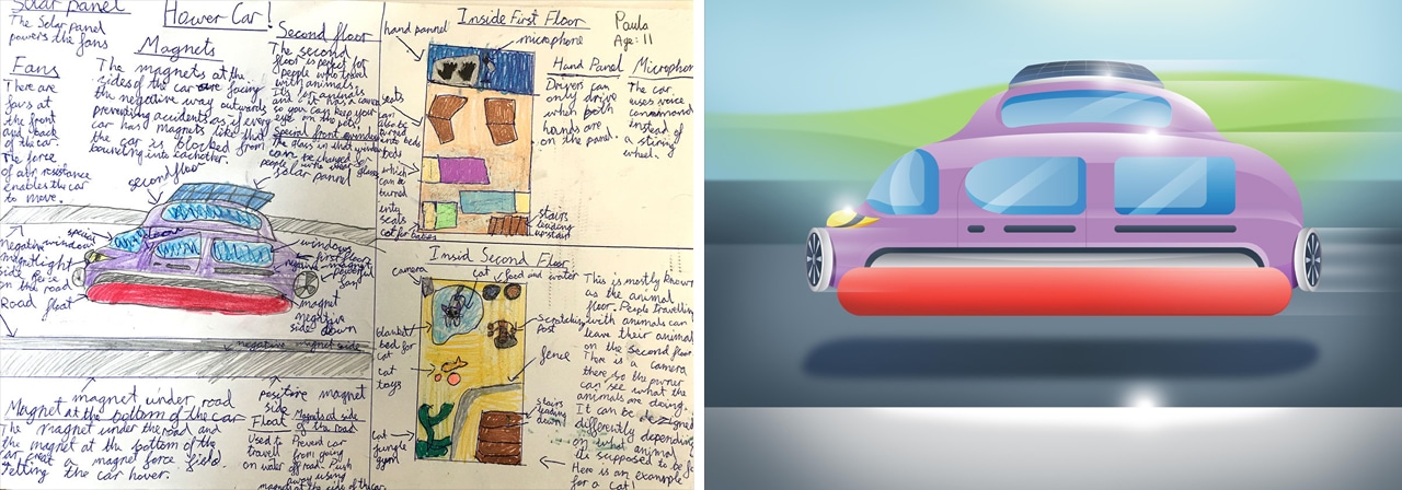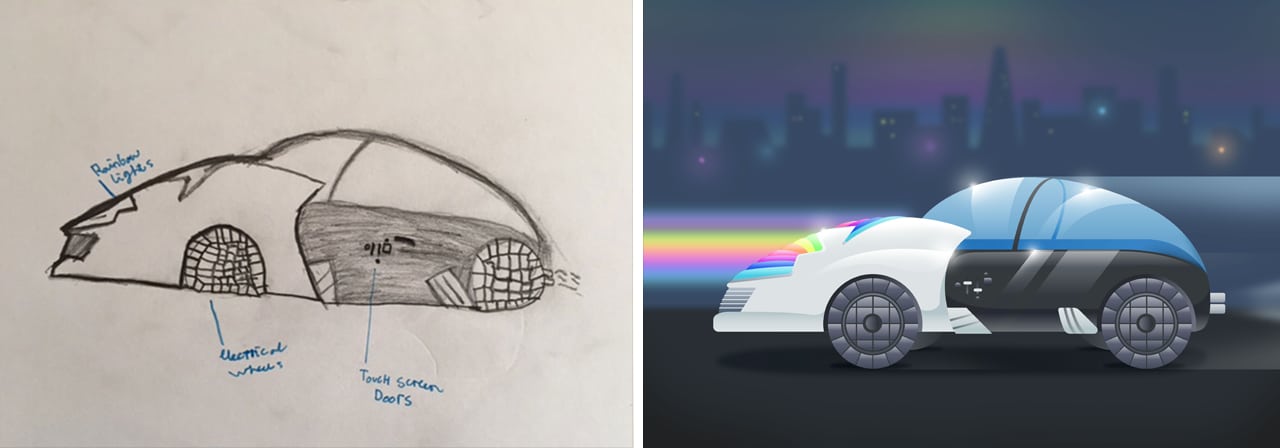 GoCompare, a car insurance comparison company based in Wales, did just this. They asked a number of school children to imagine and draw what the cars of the future might look like. The drawings were handed over to an illustrator which then gave life to their drawings.