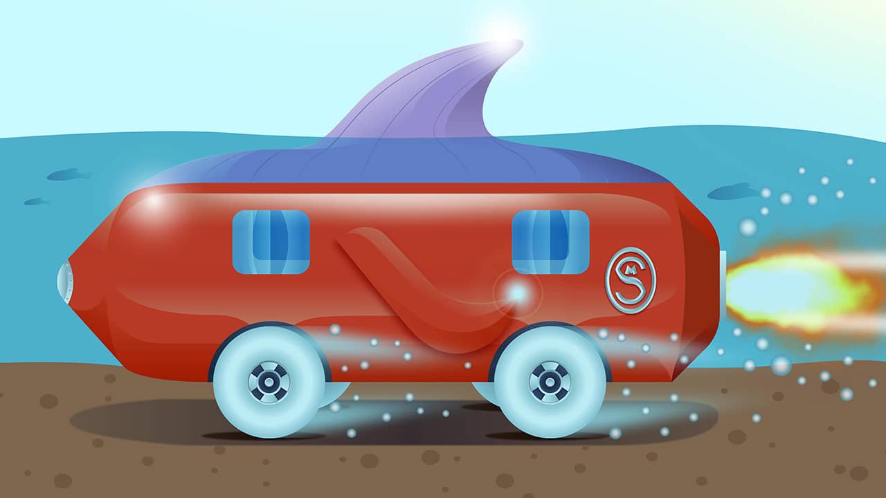I especially like the Mega Alset which is designed as a hydroelectric vehicle featuring a super cool rocket. Joel made the glass windows flexible to prevent it from shattering and a voice recognition system is on board. Most importantly, it has a funky shark fin so it can drift through water with ease.