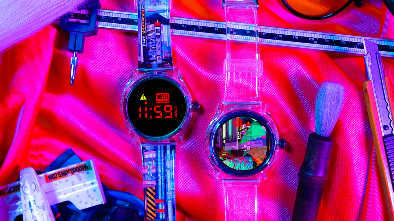 For the first time, Diesel collaborated with an artist for its limited-edition smartwatch. Mad Dog Jones, a popular Canadian digital artist, blended his cyberpunk dystopia in our reality through his work “Cyber Dream.”