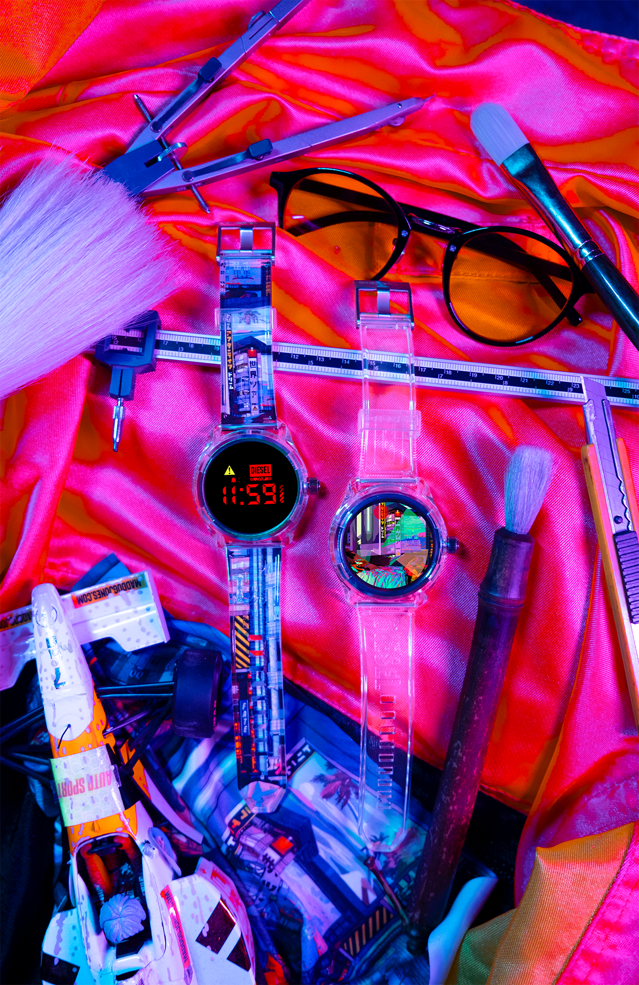 Exclusively designed for the limited-edition Diesel On Fadelite, Mad Dog Jones’ art represents the suspension in staring at a surreal reality — which is how it looks like when you look at his design om your wrist.