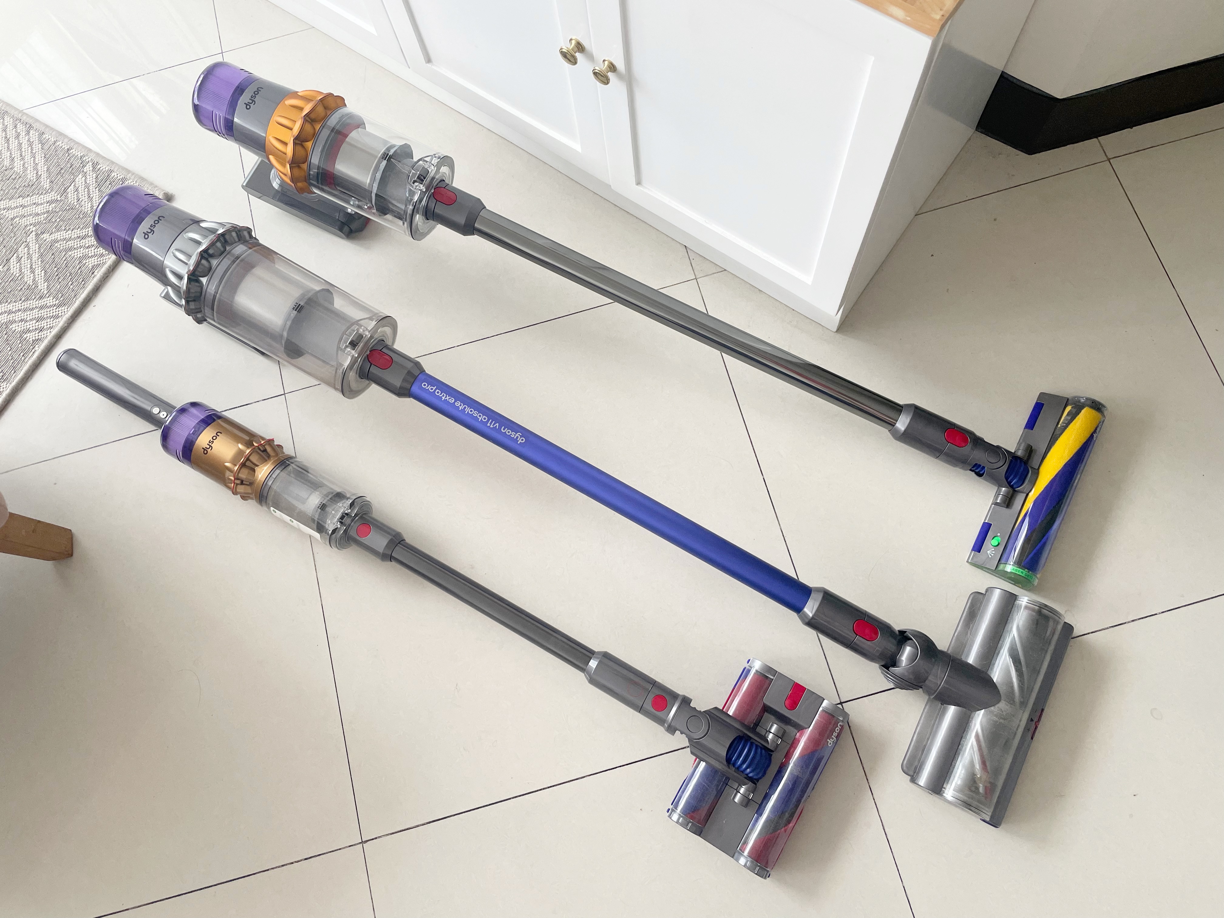For comparison: (L-R) The Dyson Omniglide, V11 Absolute Extra Pro (EU release), and the Dyson V15 Detect Absolute.