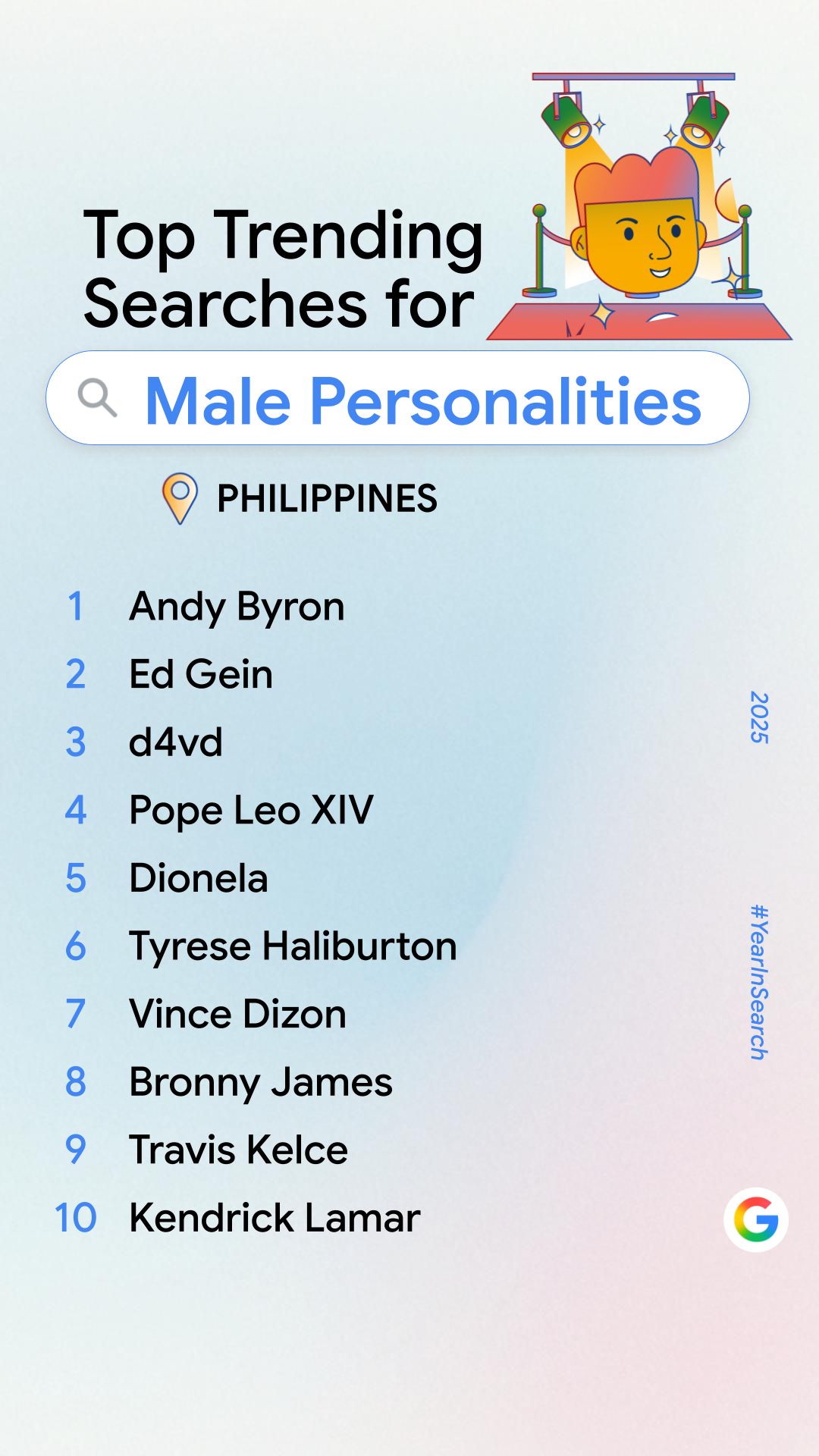 Meanwhile, for male personalities, Dionela is at No. 4 on a more diverse list which includes Andy Byron (No. 1), Ed Gein (No. 2), and even Department of Transportation and Communications (DOTr) Secretary Vince Dizon (No. 7) and Bronny James (No. 8).