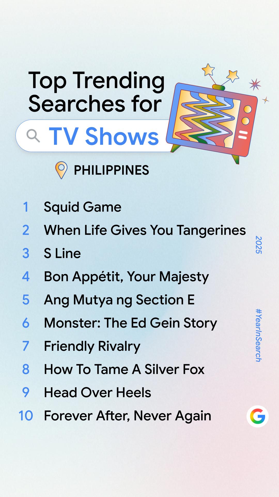 Netflix series Squid Game also made the Top 10 list at No. 6. Reflecting the Philippines’ unwavering love for basketball, “OKC vs Indiana” also made it to No. 9. The Oklahoma City Thunder, of course, beat the Indiana Pacers in seven games to hoist this year’s NBA title.