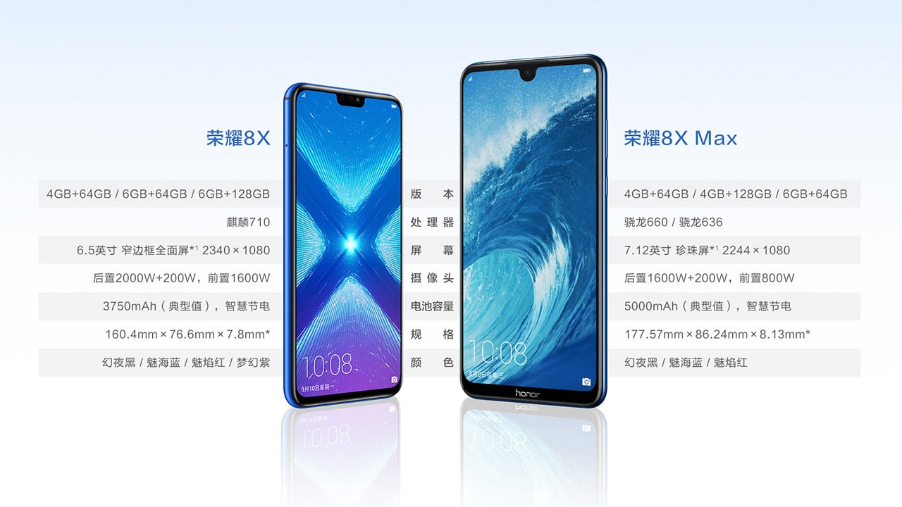 The Honor 8X currently starts at CNY 1,399 (US$ 205) for the lowest config, while the cheapest Honor 8X Max retails for only CNY 1,499 (US$ 220). The available colors are black, blue, and red — with an additional purple variant for the regular Honor 8X.