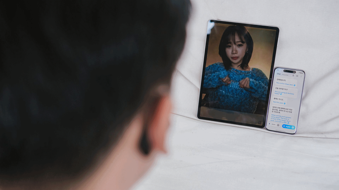 Using the Interpreter mode on AI Translate, the device listens to the speaker (in this case, Chaewon). It first translates on the phone and then a voice relays and plays the translation on the Earbuds Open.