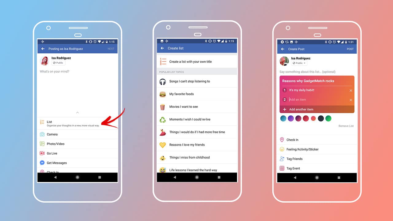 You can find this option (if you already have it) on the status bar as one of the options. After ticking “List,” you’re given the option to pick from popular topics which include “Reasons I love my friends,” or “Movies I want to see.” You can also just create a list with your own title.