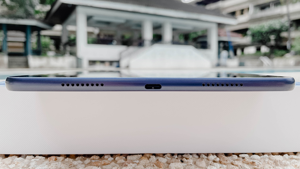 On the left side of the device, you will be able to find the speakers along with the sleep/wake button. The right side shows you another pair of speakers and a charging port.