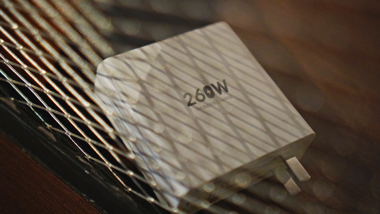 Nothing fancy here, just the basics. Front and center is the wireless charging stand. To the left, there’s the 260W power brick and a USB-C to USB-C cable. And to the right is the aforementioned prototype phone.