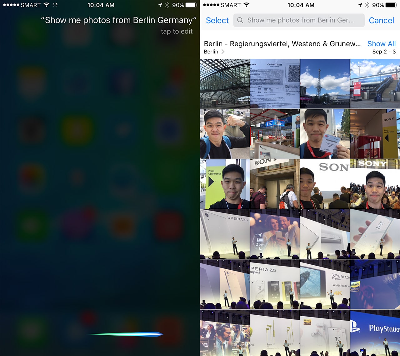 Following massive improvements to Google Now, Apple made sure that its sassy personal virtual assistant, Siri, caught up with competition in iOS 9. Across the board Siri is smarter and more powerful than ever before. She“can search a wider range of topics for a wider range of answers” has better natural language processing and can understand the context of your questions. For example I can ask her to “show me photos from Berlin” and she’ll display photos that I took at IFA 2015 earlier this month. Swiping to right of the home screen also brings up something called “Siri Suggestions,” a list of people you most frequently contact, apps that you might use based on where you are or the time of the day it is, and even a list of interesting or useful establishments nearby.