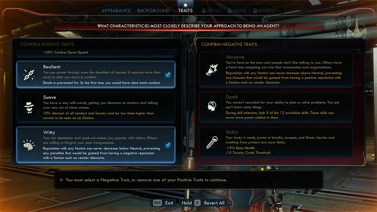 Along with this, the game also introduced the choice of a negative trait to balance you out whenever you opt to have two positive traits. It’s just their way of reminding you that even in futuristic Earth, nobody’s perfect!