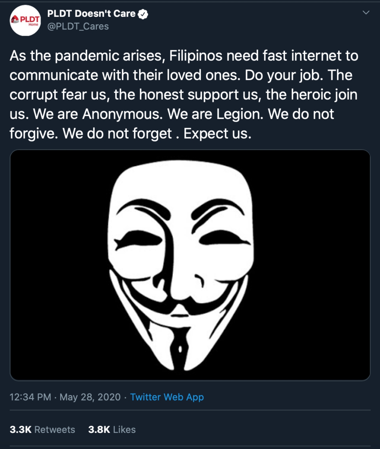Specifically, the customer service support account Twitter @PLDT_Cares has been taken over by hackers. The hacking announcement came with the frustration that PDLT hasn’t been able to provide the Internet connection required by many to continue to communicate with their loved ones amid the Coronavirus pandemic.