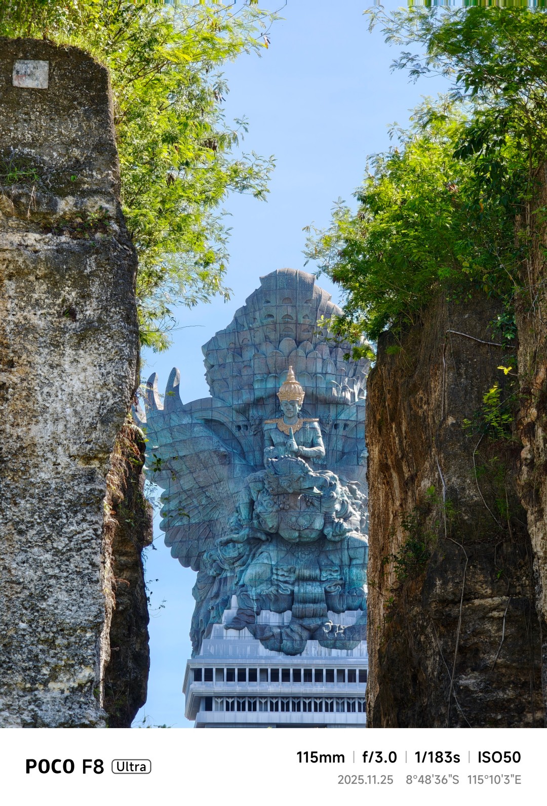 A framed shot of the Vishnu and Garuda fountain at the GWK entrance, taken through tree branches.