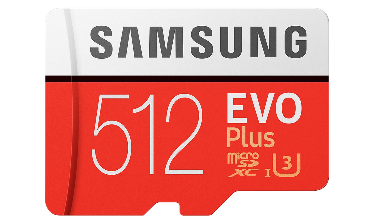 Again, the 512GB microSD card is part of Samsung’s Evo Plus range which has a read speed of up to 100MB per second and write speed of up to 90MB per second. It supports 4K video recording and comes with an SD adapter.