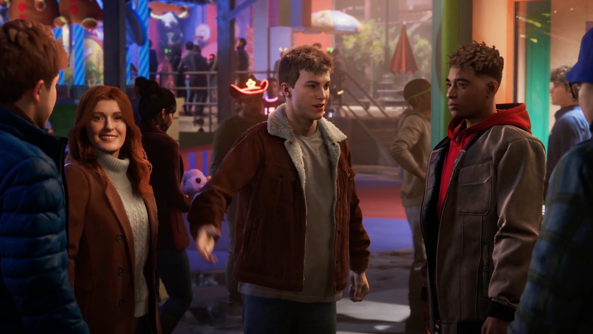 The story trailer gives us our first glimpse of our Spider-Men — Peter and Miles — without their masks. We also see MJ who’s let her hair down.