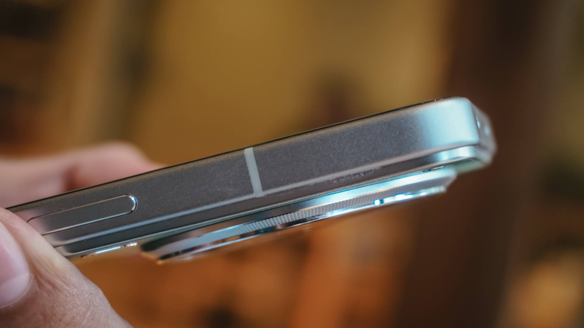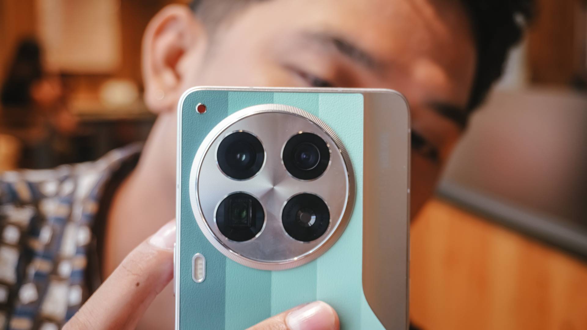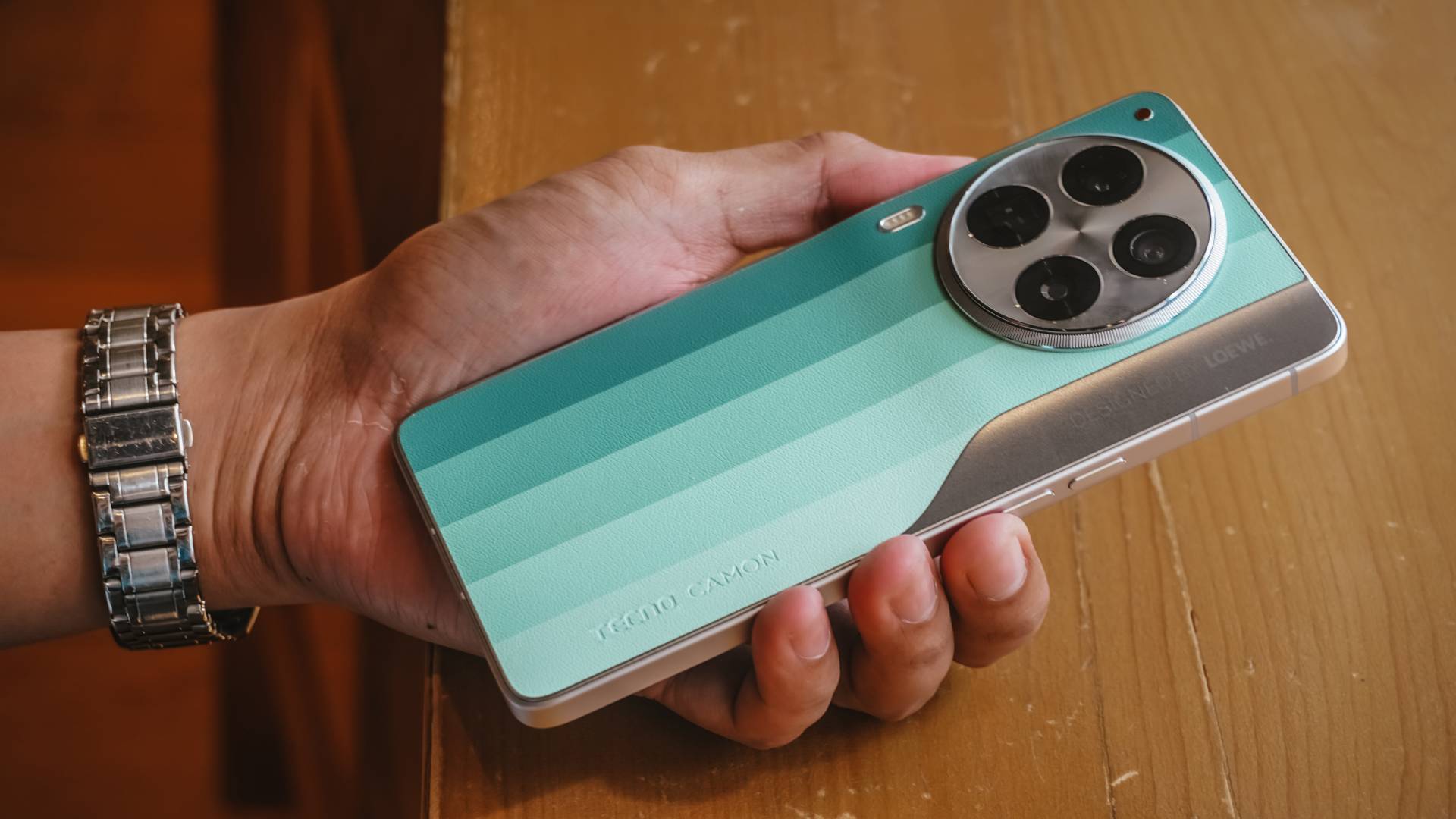 The faux leather back introduces texture and warmth. The clean lines and slim profile bring a sense of restraint. And then there are the gold sides and camera island — a gentle nod to discrete luxury.