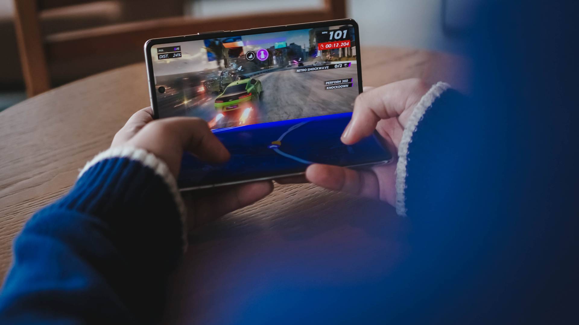 This foldable form factor even enables the racing game to run in split-screen — actual racing gameplay above, racing track course plus controls at its bottom.