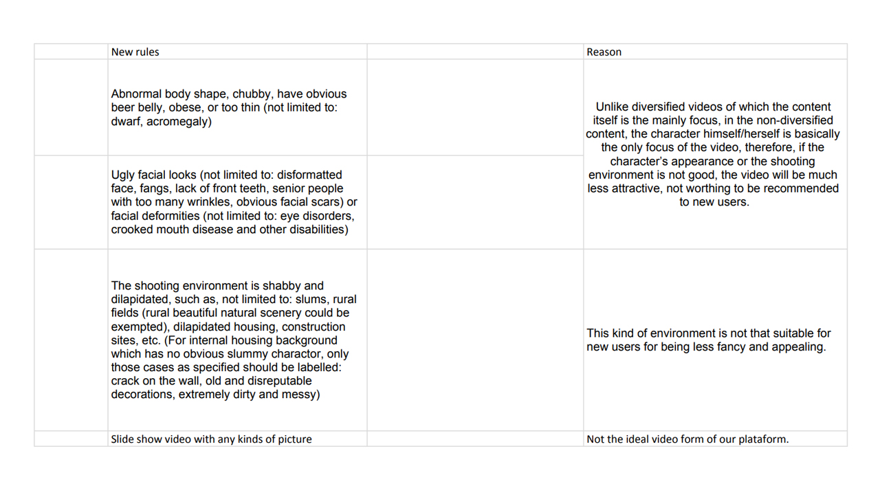 Today, American news outlet The Intercept leaked moderation policies for TikTok’s staff. In these documents, TikTok’s moderators are required to put down posts with “ugly facial looks” and deformed features. These include: “lack of front teeth, senior people with too many wrinkles, obvious facial scars,” “chubby, have obvious beer belly, obese, or too thin.”