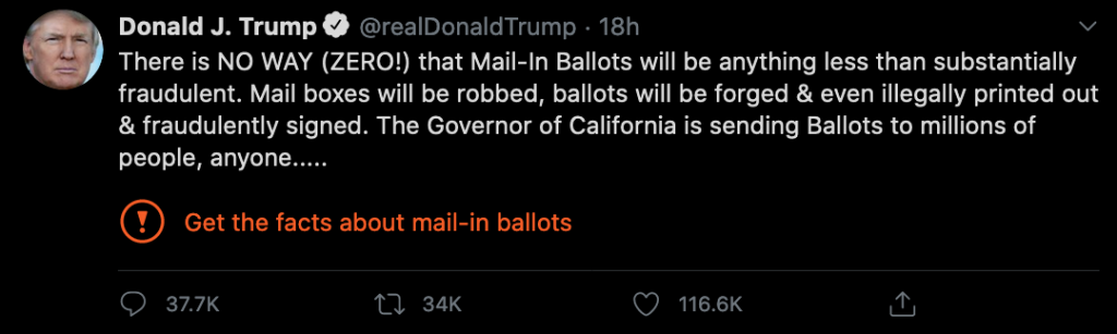 The label was added because it violated Twitter’s “civic integrity policy”, a company spokeswoman confirmed. Below the tweets, a link which read “Get the facts about mail-in ballots” took users to a notice calling the claims “unsubstantiated”, citing reporting by CNN, the Washington Post, and other credible publications.