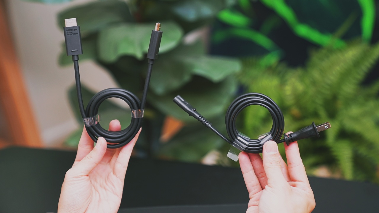 Cables. The one on the left is the Utlra High Speed HDMI cable (yes, that means HDMI 2.1), and your power cord.